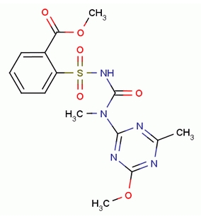 中文別名:苯黃隆;闊葉凈;2-[N-(4-甲氧基-6-甲基-1,3,5-三嗪-2-基)-N-甲基氨基甲酰胺基磺?;鵠苯甲酸甲酯;2-[4-甲氧基-6-甲基-1,3,5-三嗪-2-基(甲基)氨基甲酸氨基磺?;鵠苯甲酸甲酯;2-(4-甲氧基-6-甲基-1,3,5-三嗪-2-基(甲基)氨基甲酰氨基磺?;?苯甲酸甲酯;2-[4-甲氧基-6-甲基-1,3,5-三嗪-2-基氨基羰基氨磺?;鵠苯甲酸甲酯